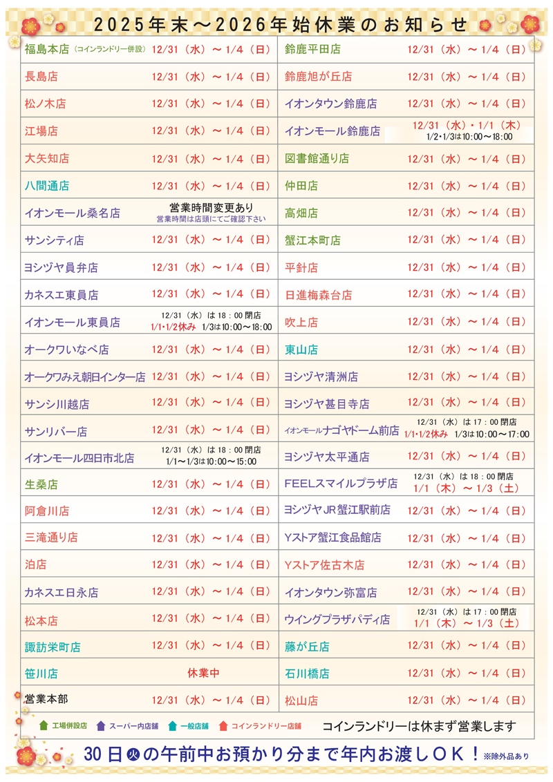年末年始休業のお知らせ