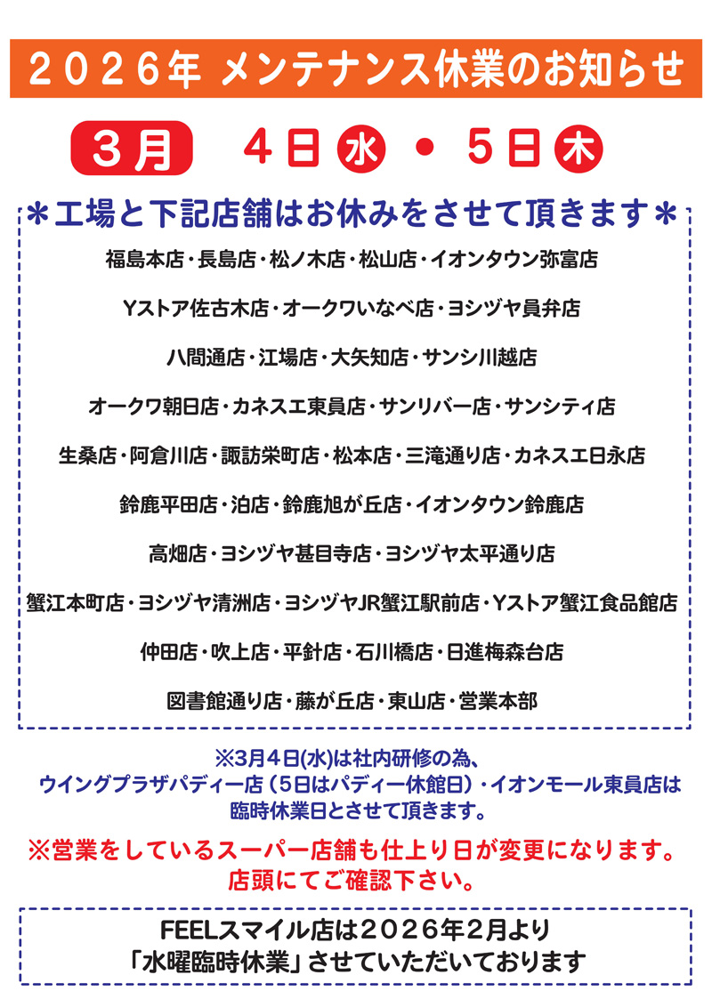 News & Topics 2026.02.28 FEELスマイルプラザ店水曜臨時休業のお知らせ 2026年2月よりFEELスマイルプラザ店は、当面の間「水曜日臨時休業」とさせていただきます。 News & Topics 一覧へ